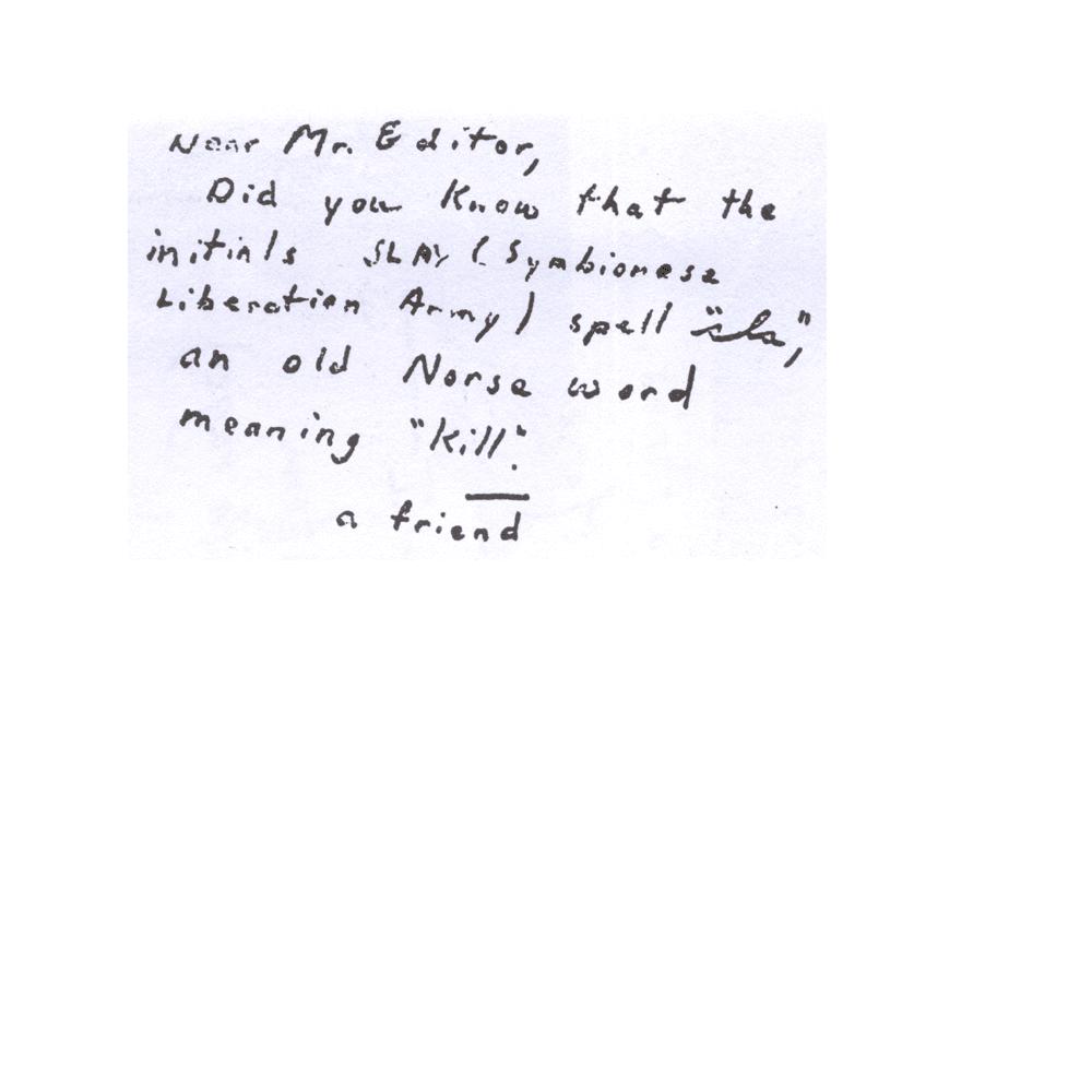 SLA is an anagram for Anton Szandor LaVey and from all of the reports he was a killer and the ‘COS” was very involved with Norse philosophy. Notice also how he calls himself a “Friend”. A reference to “Your Secret Pal”
