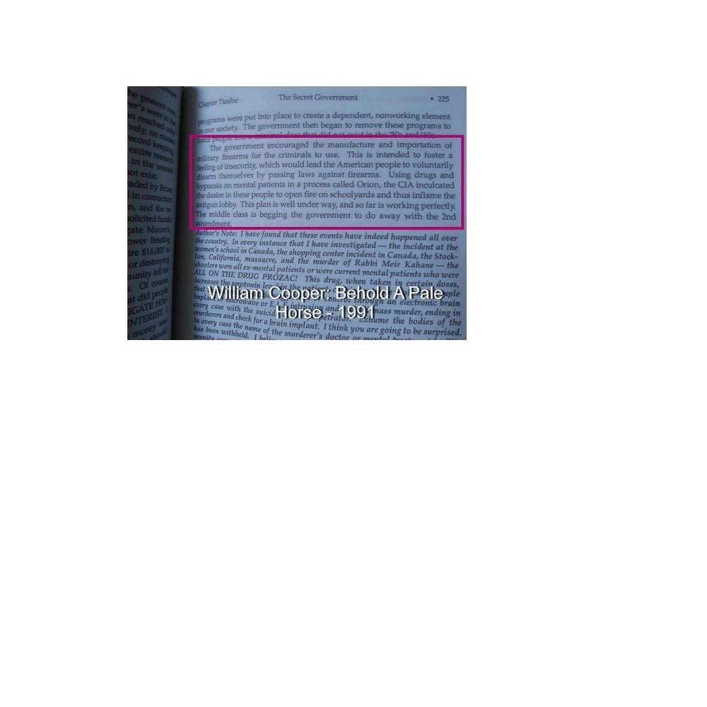 The government encouraged the manufacture and importation of firearms for the criminals to use. This is intended to foster a feeling of insecurity, which would lead the American people to voluntarily disarm themselves by passing laws against firearms. Using drugs and hypnosis on mental patients in a process called Orion, the CIA inculcated the desire in these people to open fire on schoolyards and thus inflame the anti-gun lobby. This plan is well under way, and so far is working perfectly. The middle class is begging the government to do away with the 2nd Amendment.”