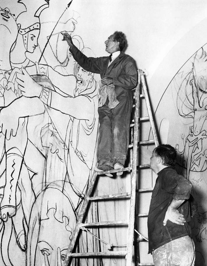 “See the ‘Black Sun’ of the alchemists? The Rose of the Rosicrucians is at the foot of the (rose-)cross. The figure on the extreme right has the ‘fish’ symbol of Christ on his eye (the photo is cropped), indicating that he is Jesus. Hold on a minute then – if that is Jesus looking on at the crucifixion, who is that on the cross? Cocteau himself looks away in disgust from the travesty of the accepted version of the crucifixion. Lots of other symbolism in the mural, but that’s another story. He was an independent Rosicrucian, as many in France are. Not a member of the fictitious ‘Priory of Sion’, as the new age fantasists and delusionaries will have it, and not a member of the SRIA either.”
